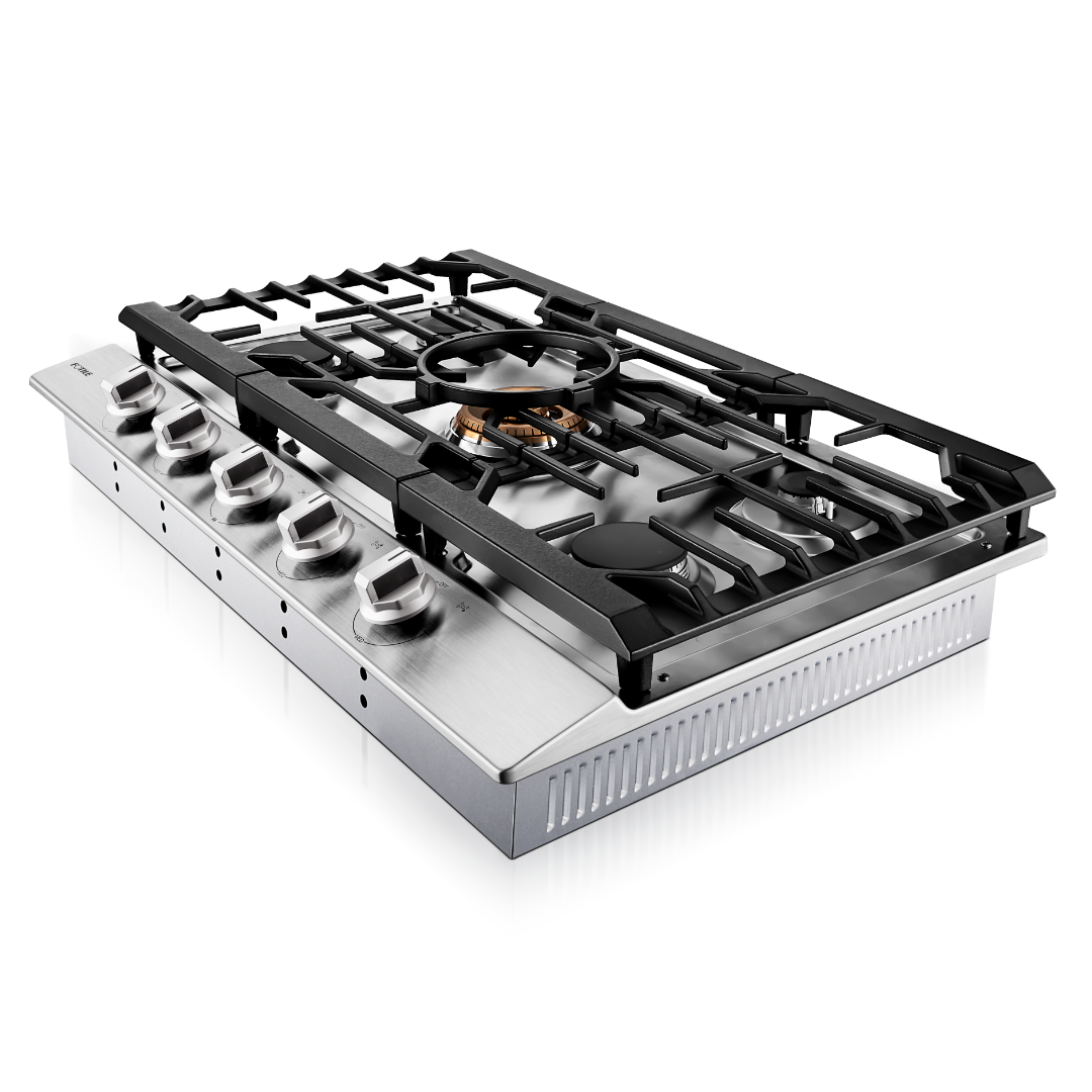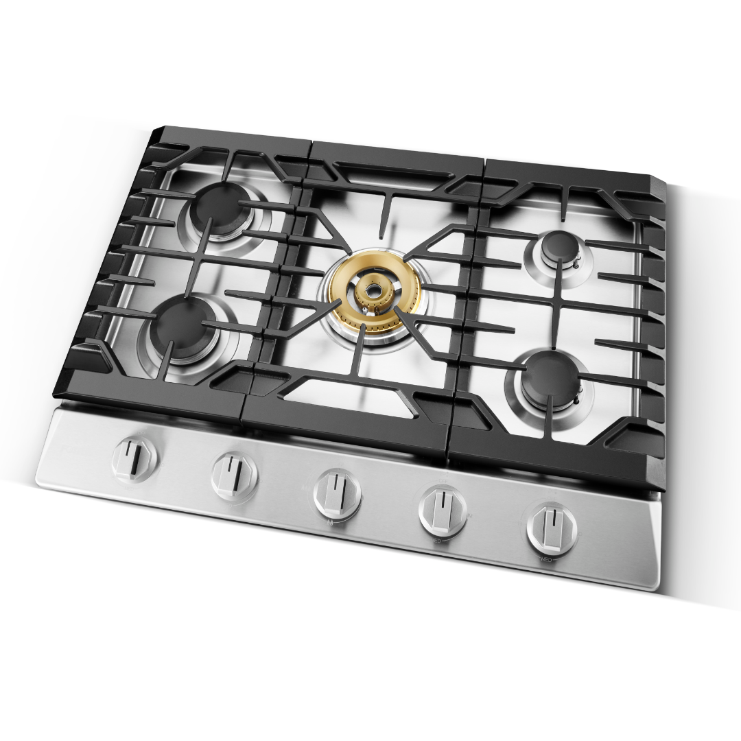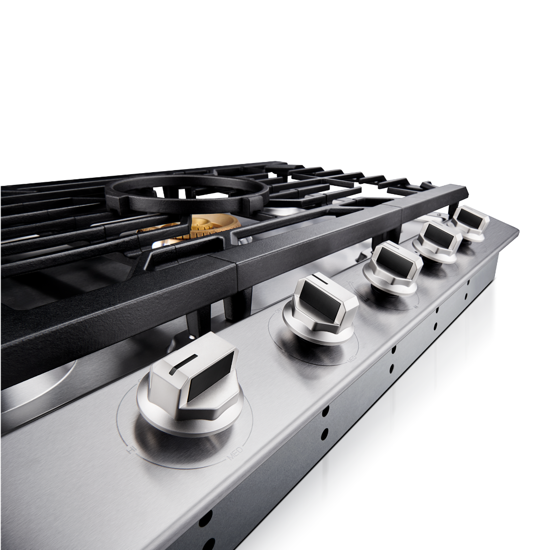 We use Cast Iron cooking grates that run from edge to edge on the cooktop. This means, you will always have space to put small and large pots and pans no matter what size or shape they are. It also allows you to move a hot heavy pot easily and safely from one burner to another if you need to. Continuous edge to edge grates makes it easier to cook on your cooktop surface. Cast Iron grates also offer long lasting performance.