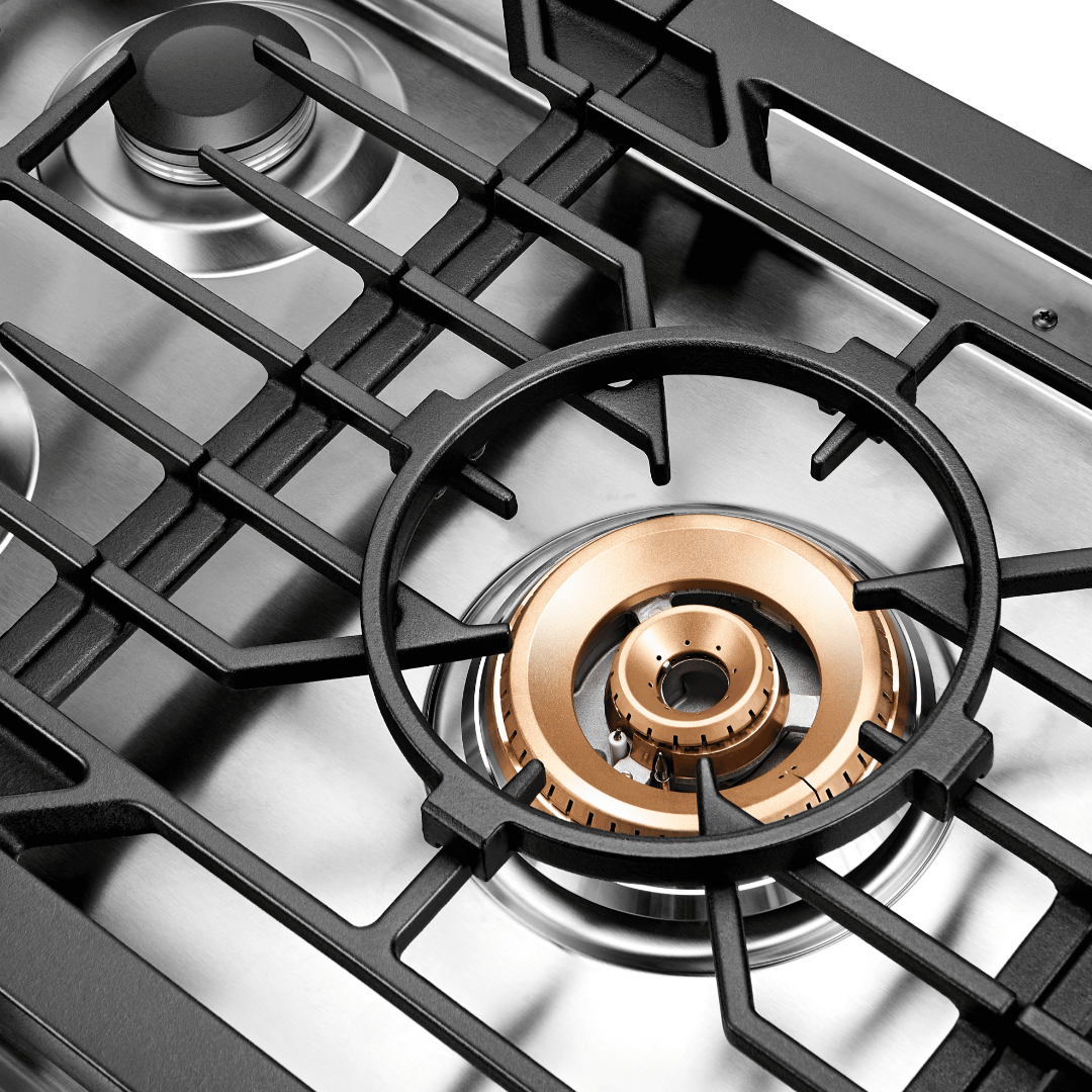 The Tri-Ring cooktop is easy to clean. It features sealed burners so liquids will not seep into the burner mechanism. The burner caps and cast iron cooking grates are removable so you can hand wash them in warm water and soap, and then you can wipe down the cooktop surface to keep it clean.